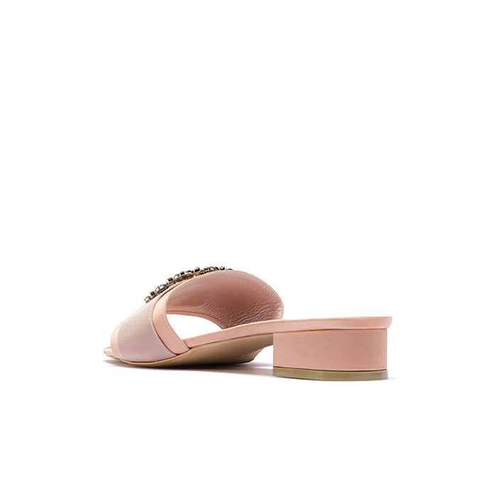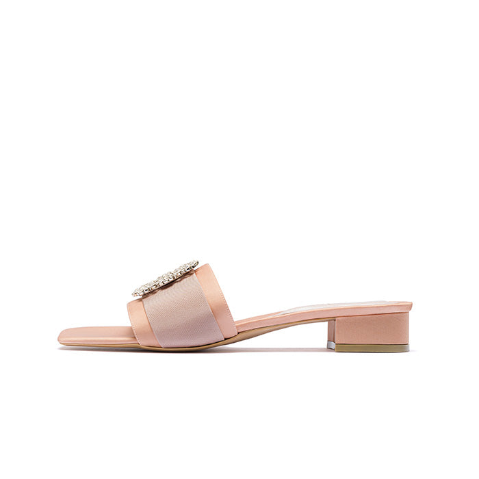 CIARA celebrates understated elegance with its refined design. Handcrafted in luxurious satin, these 1-inch block heel sandals offer a perfect blend of sophistication and comfort. The matching grosgrain ribbon and striking Silver Monique ornament create a captivating visual harmony.