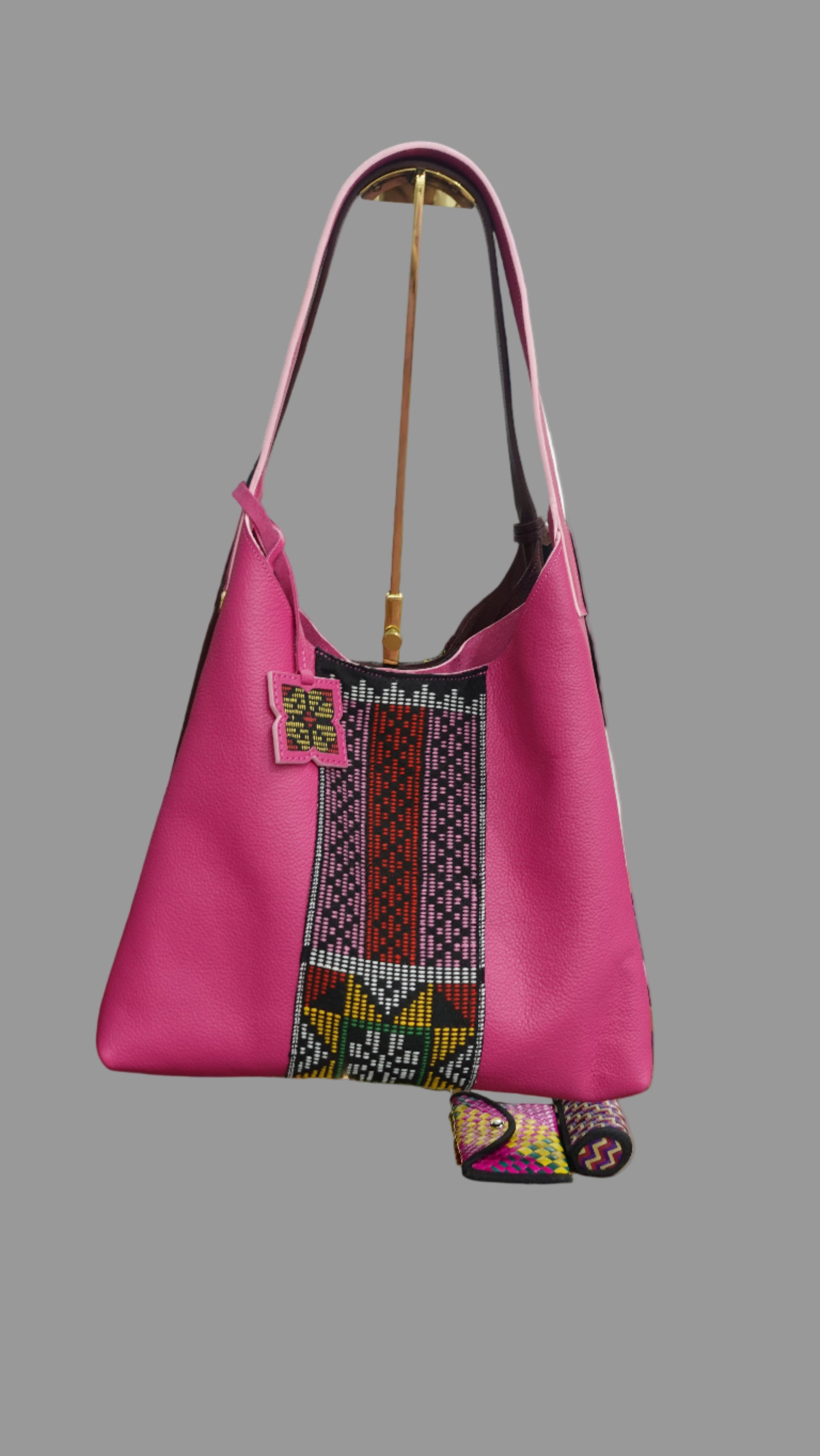 Soft, unstructured leather meets Sabah's centuries-old Kain Dastar. Handcrafted locally, this tote features timeless Iranun motifs woven by master artisans. Built for daily use with durable craftsmanship that honours heritage. Comes in three colourways - dark beige, burgundy and fuschia pink.