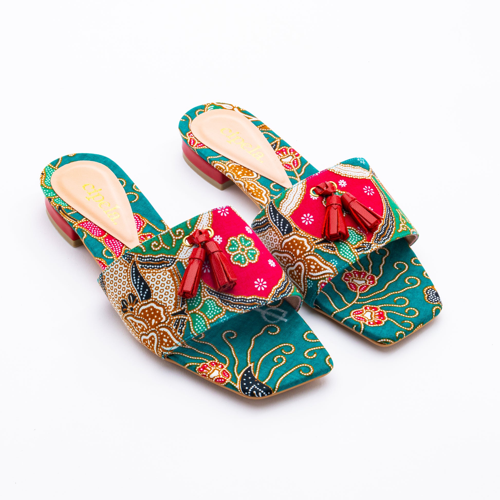 SURIA celebrates artistry with its all-over batik design, complemented by a striking red tassel. These slider flats offer both style and comfort, lined with eyelet drop hand-cut genuine leather. Perfect for elevating a casual day look or adding a touch of tradition to a modern outfit.